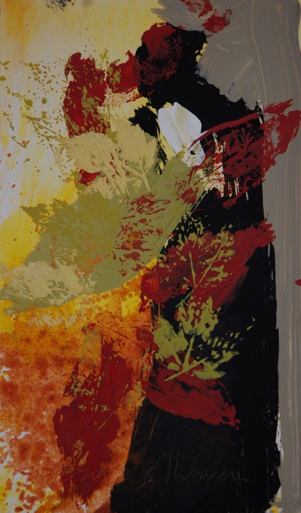 Los cinco arces del jardín son protagonistas diarios de mi mirada, su dimensión es ya desbordante y eso se agradece en Verano. Una imagen tan poderosa que he ido pintando a lo largo de los años acompañándolo en su crecimiento y en su transformación con las estaciones. Desde el primer momento en que decidí ponerme a pintarlos creí que un icono que forma parte del día a día tenia que colaborar y participar de una forma importante en la obra, por eso cuando llega el Otoño nunca recojo las hojas del suelo y las dejo como un abrigo para el césped durante el Invierno produciendo un cambio de color en el paisaje. Es justo en ese momento en el que encuentro la forma en que el Arce podía participar directamente en los cuadros , solo tenia que recoger alguna hojas añadirle color y hacer estampaciones con ellas. Toda la obra sobre lienzo y sobre papel de las Series Arce están hechas de esta forma.