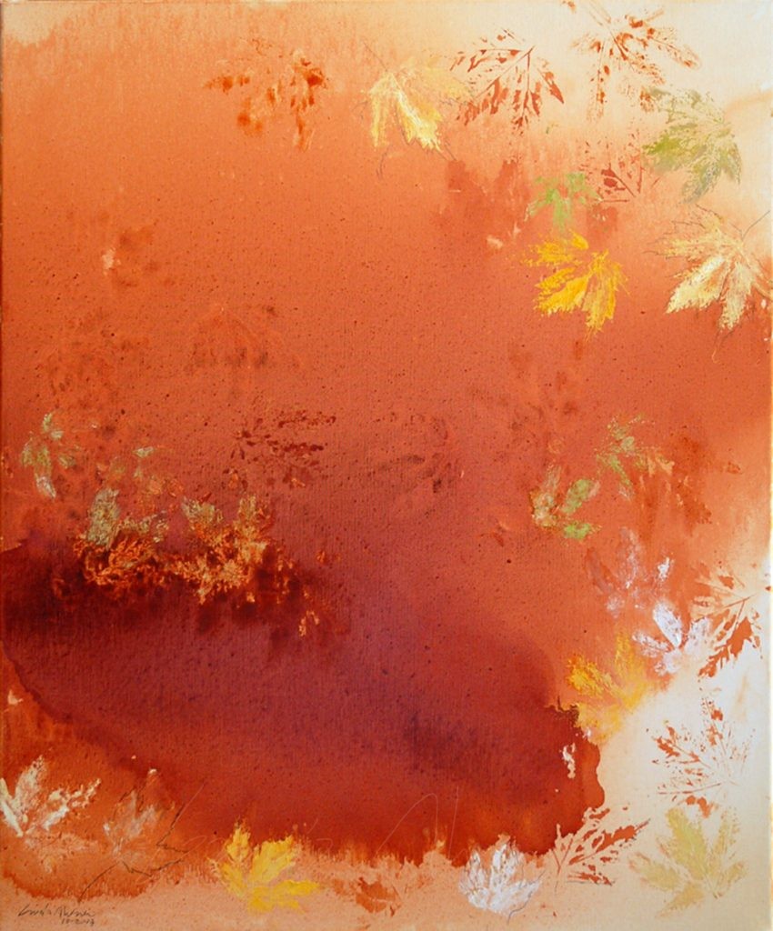 Los cinco arces del jardín son protagonistas diarios de mi mirada, su dimensión es ya desbordante y eso se agradece en Verano. Una imagen tan poderosa que he ido pintando a lo largo de los años acompañándolo en su crecimiento y en su transformación con las estaciones. Desde el primer momento en que decidí ponerme a pintarlos creí que un icono que forma parte del día a día tenia que colaborar y participar de una forma importante en la obra, por eso cuando llega el Otoño nunca recojo las hojas del suelo y las dejo como un abrigo para el césped durante el Invierno produciendo un cambio de color en el paisaje. Es justo en ese momento en el que encuentro la forma en que el Arce podía participar directamente en los cuadros , solo tenia que recoger alguna hojas añadirle color y hacer estampaciones con ellas. Toda la obra sobre lienzo y sobre papel de las Series Arce están hechas de esta forma.