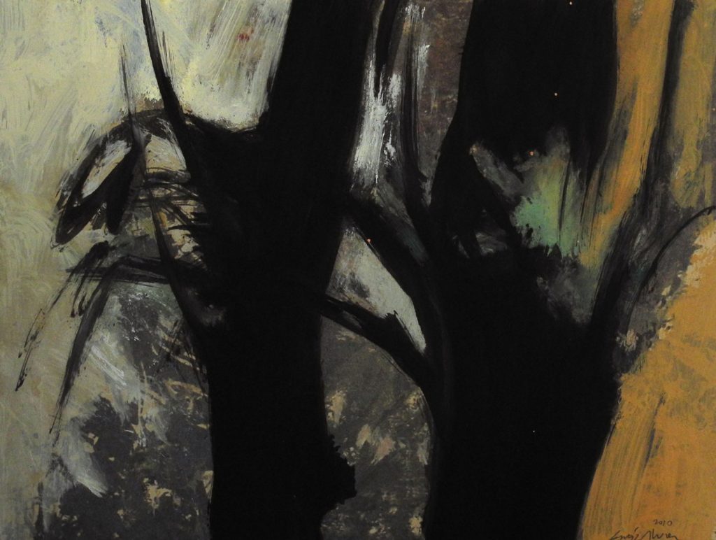 Una de las pocas Series que he realizado solo sobre papel, el soporte ideal para conseguir el resultado al que quería llegar. El reflejo de unas sensaciones producidas como casi siempre al atardecer, ese momento mágico que solo encuentro en la luz que se produce en ese momento en que cae el Sol en los paseos por un espacio cercano. Troncos negros violáceos con un fondo de luz cegadora.