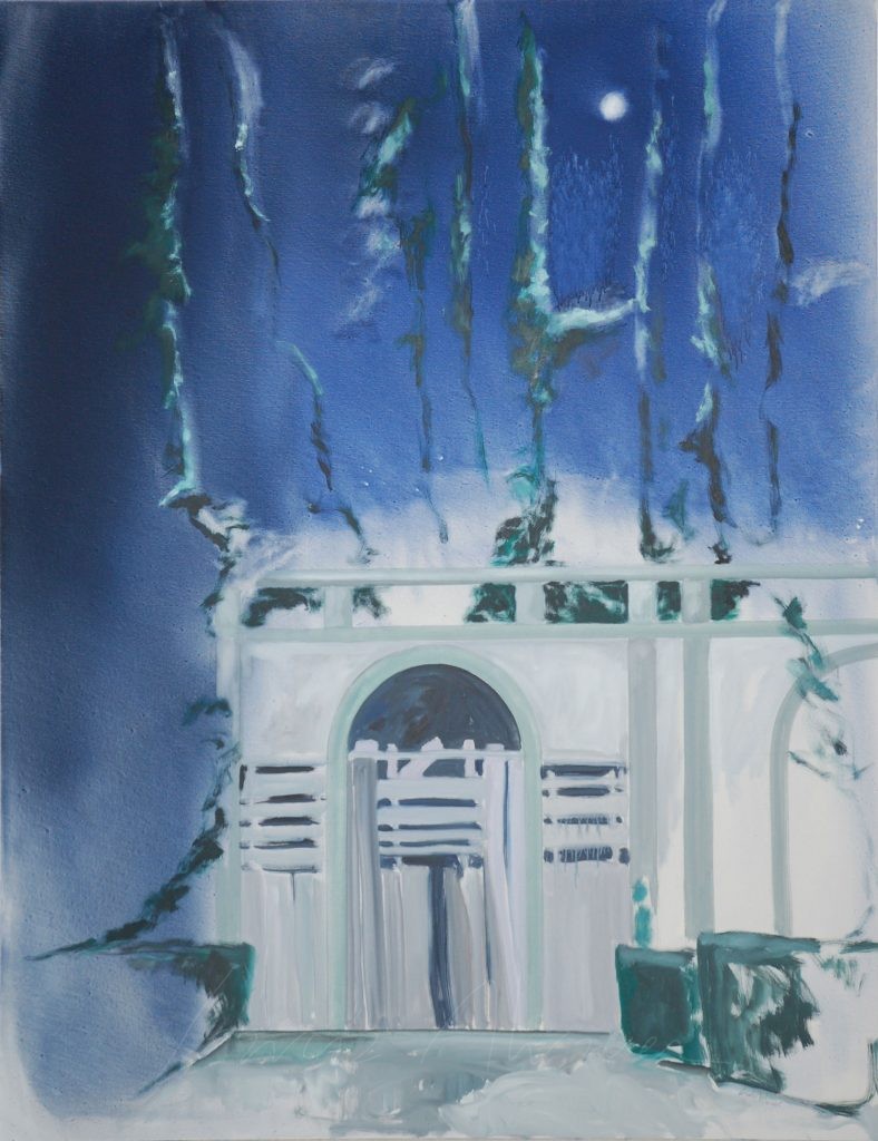 Decidí utilizar un mismo formato de 162 x 130 cm. Y pintar seis interpretaciones de cada uno de los cuadros pintados por Velázquez en los que se iba viendo el paso de las estaciones. El denominador común seria respetar el dibujo de la arquitectura que aparecen en los cuadros originales y hacer desaparecer los personajes existentes para sustituirlo por una Menina que aparece en algunos de los cuadros integradas en los jardines.